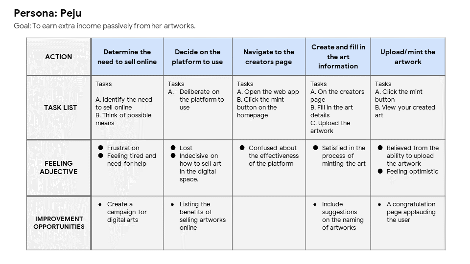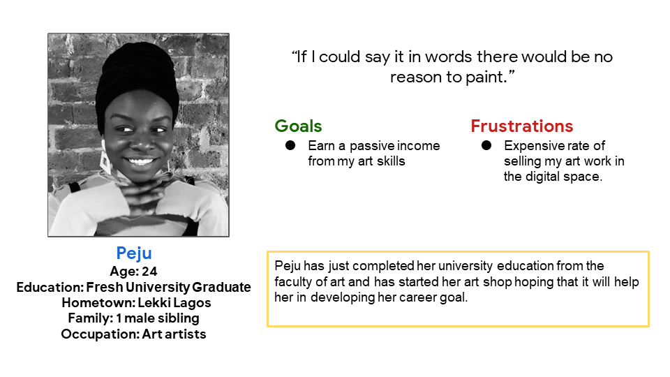 Peju is a young entrepreneur in the art industry who needs a platform where she can sell her artwork to earn extra income and grow her business.